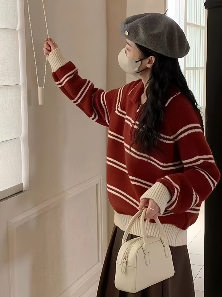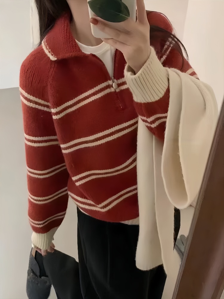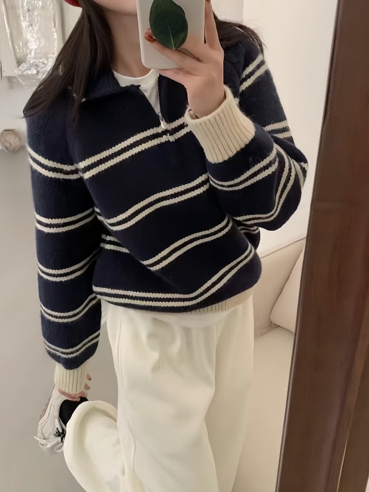 韩系polo领条纹套头毛衣女秋冬翻领半拉链软糯减龄厚款针织衫上衣