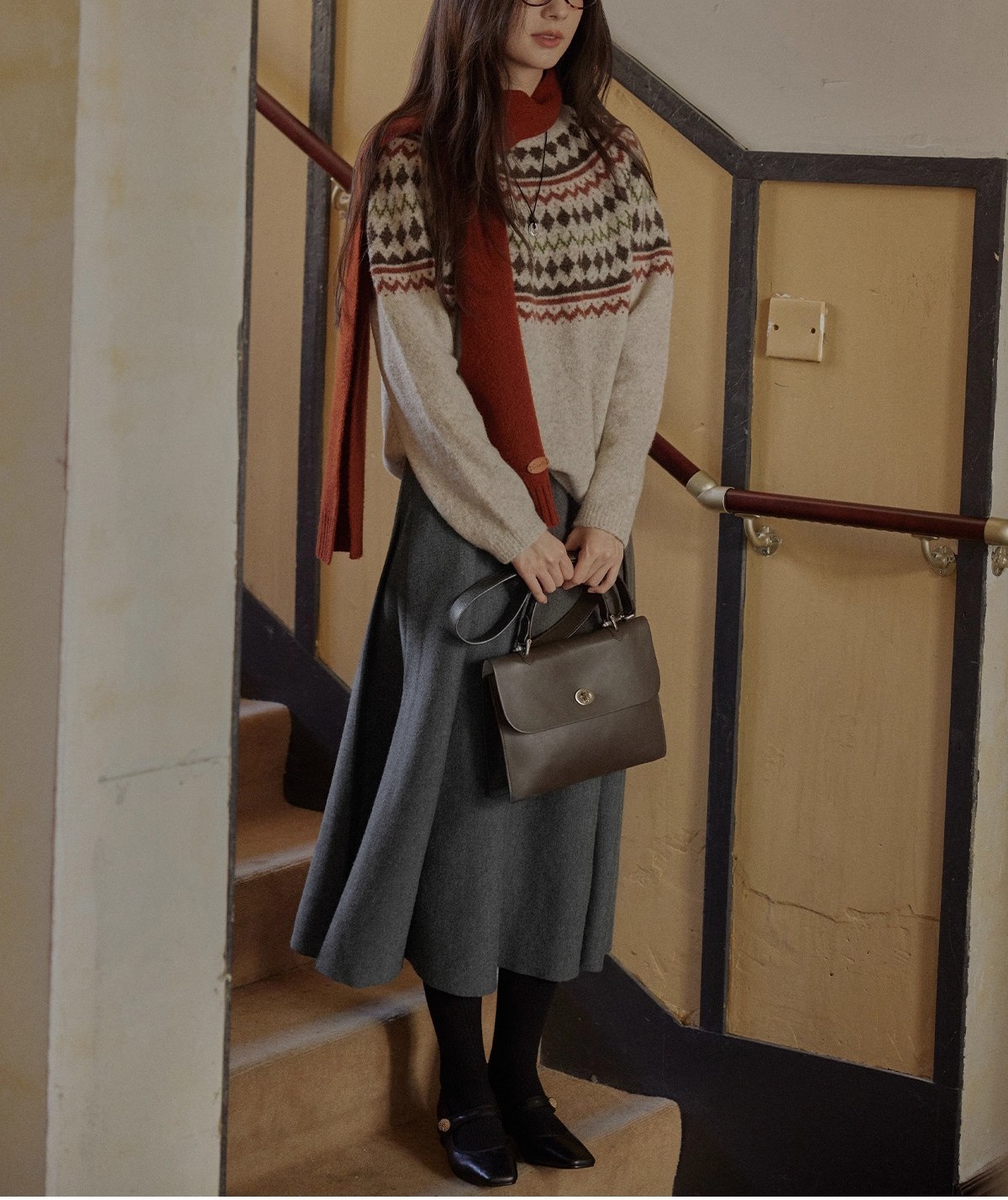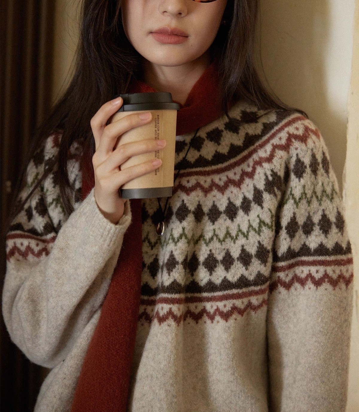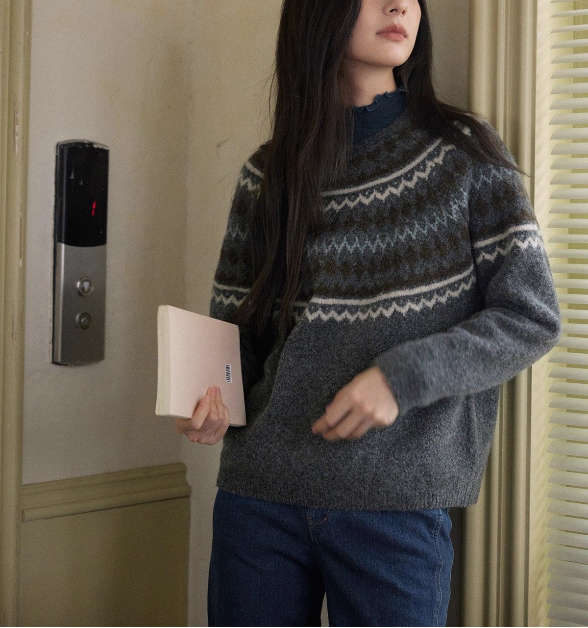 Wool Fair Isle Knit Crewneck Sweater Women Soft Top
