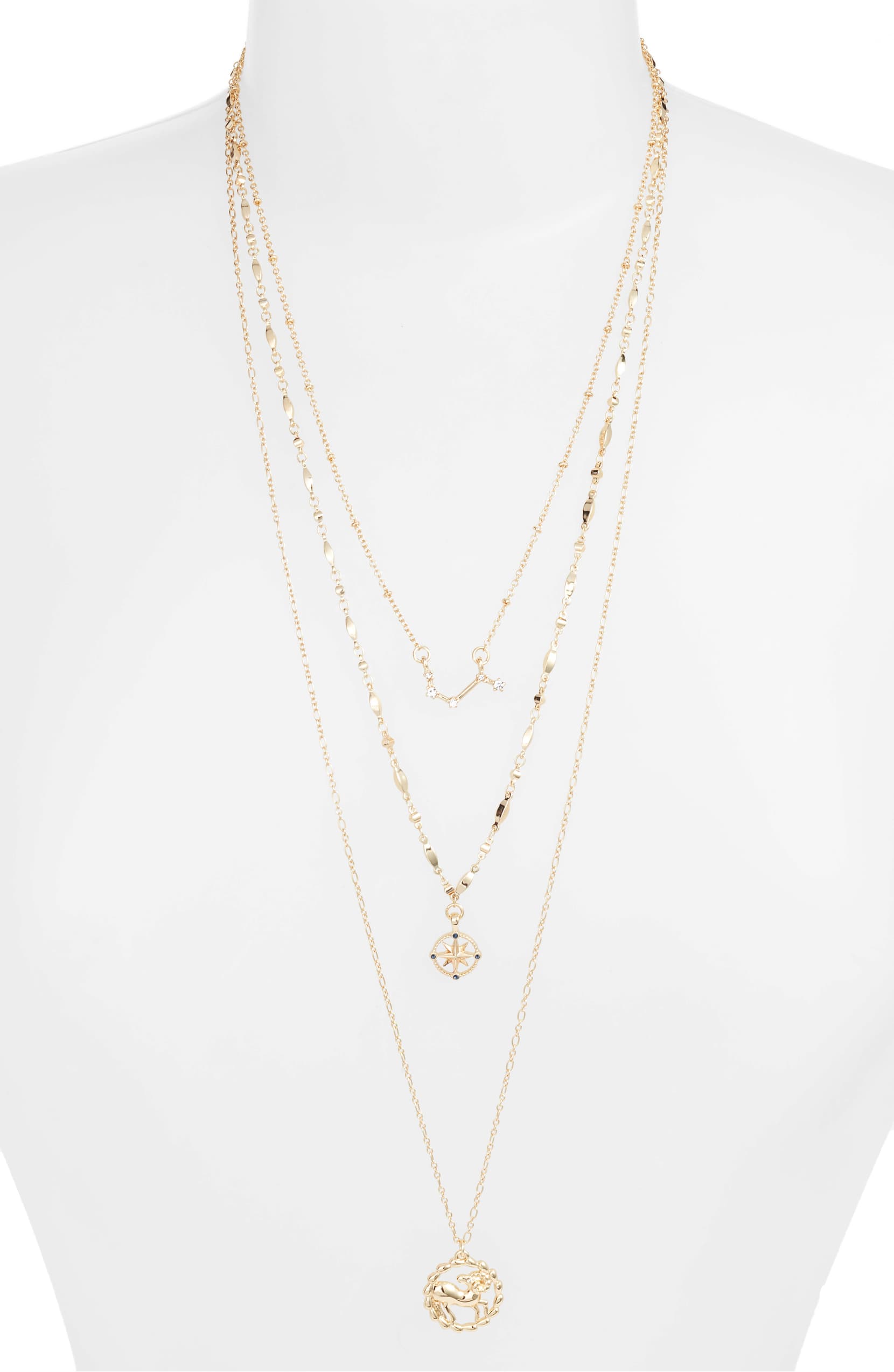 Triple layered gold necklaces with assorted Aries-themed charms.