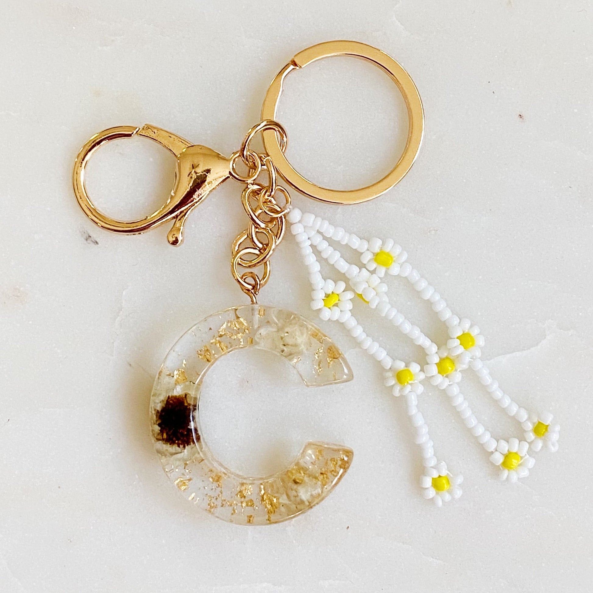 Such an adorable acrylic block initial key chain with real daisy flowers inside. Trendy daisy beaded strings adds more precious touch to this key chain.