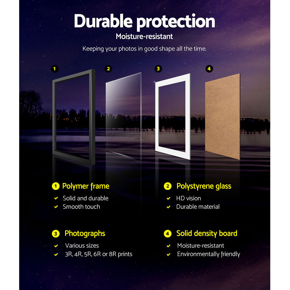 Every picture tells a story. And we are sure your extensive photo collection has lots to tell. So why not frame up the interesting ones on the wall and share the stories behind them to friends and family. You can do that beautifully with our charming Photo Frame Set. Available in a set of 11, our set allows your walls to be graced with fascinating stories and memorable moments from your treasured photographs. Arrange them in any way you like. Portrait or landscape, the framed photo feature wall is a conversational piece in its own right. Suitable for a range of photograph sizes from 3R to 8R, the frames feature a durable polymer construction with a polystyrene glass to keep your prints in good shape. The hardboard backing is also moisture-resistant. Hanging accessories are also included with your purchase.
